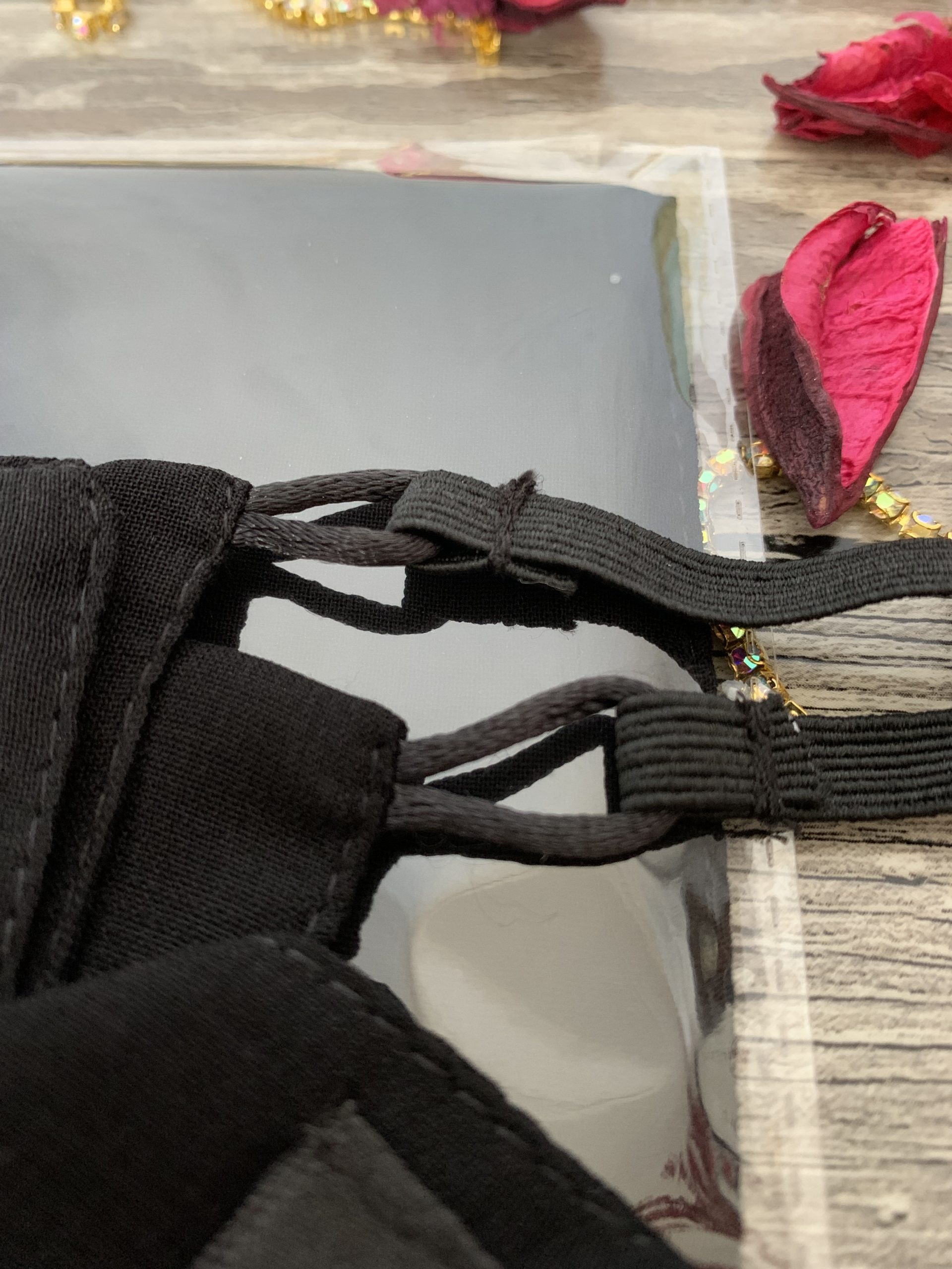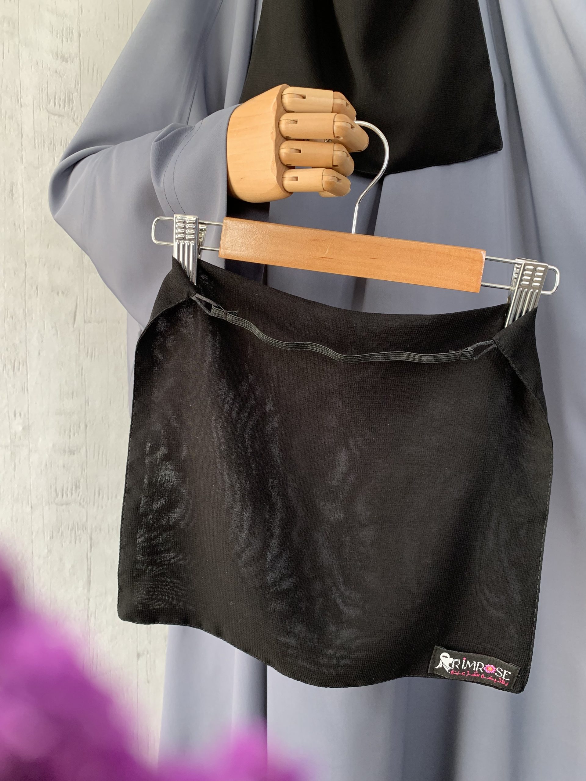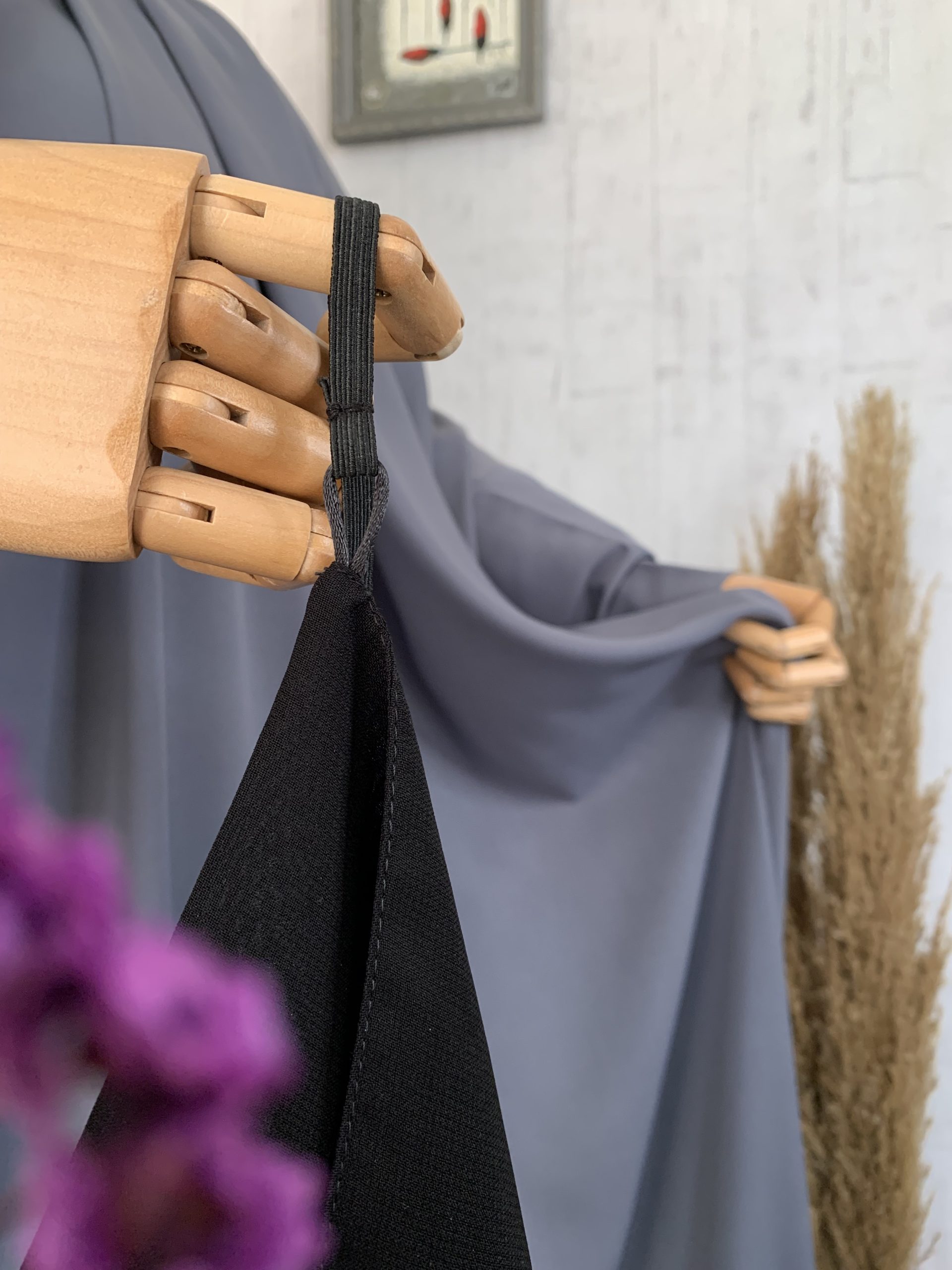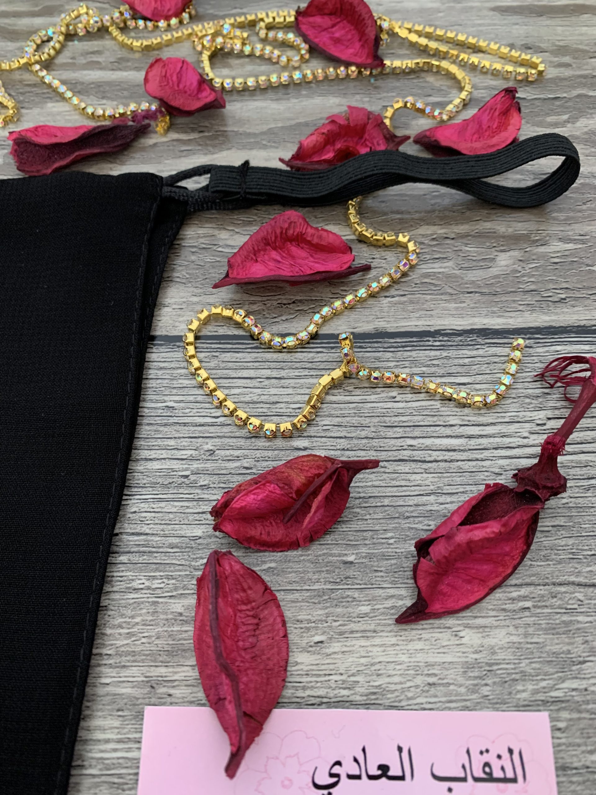 النقاب مكون من قطعة امامية مستطيلة الشكل و تربط على الوجه بشريط مطاطي قابل للاستبدال بكل سهولة في البيت tisme