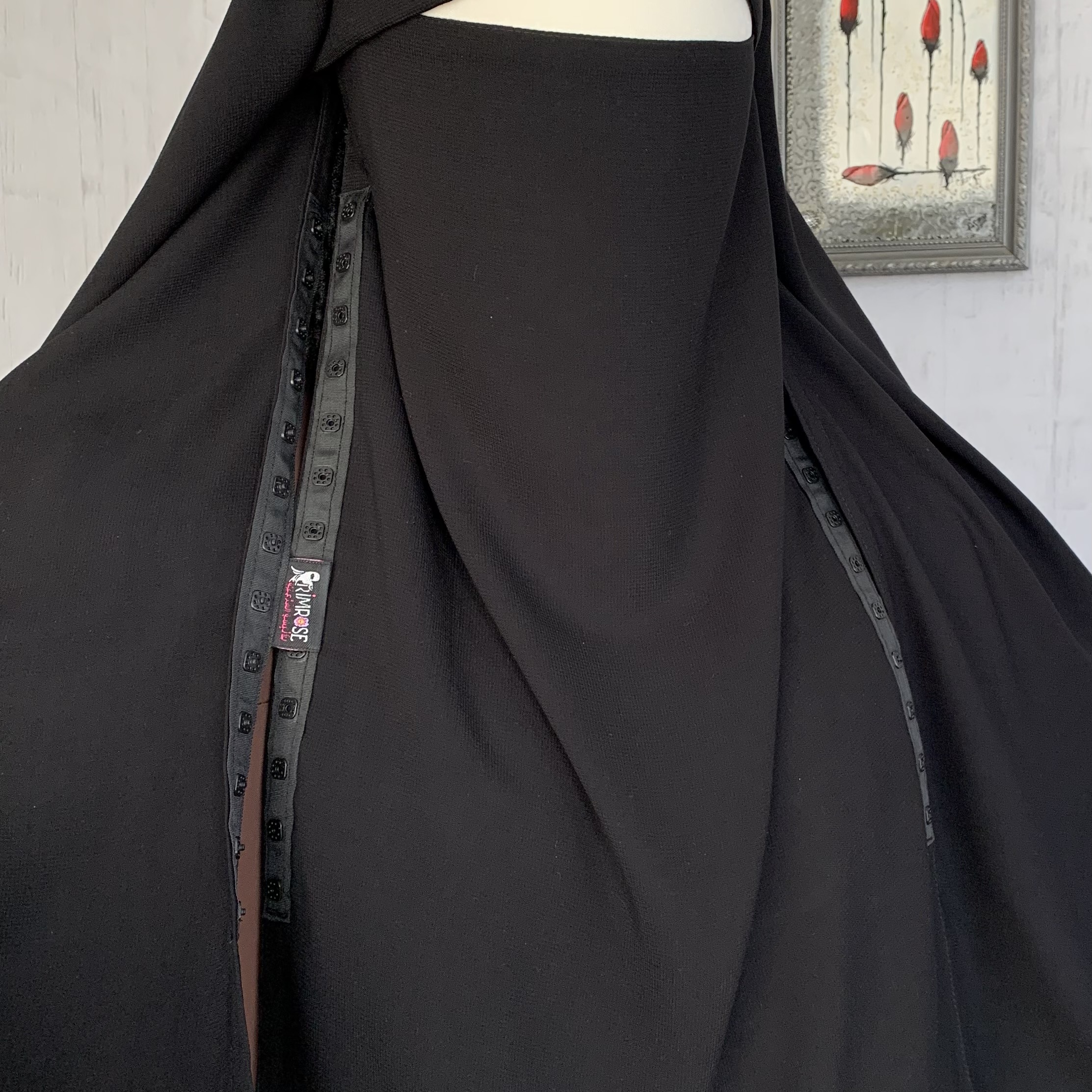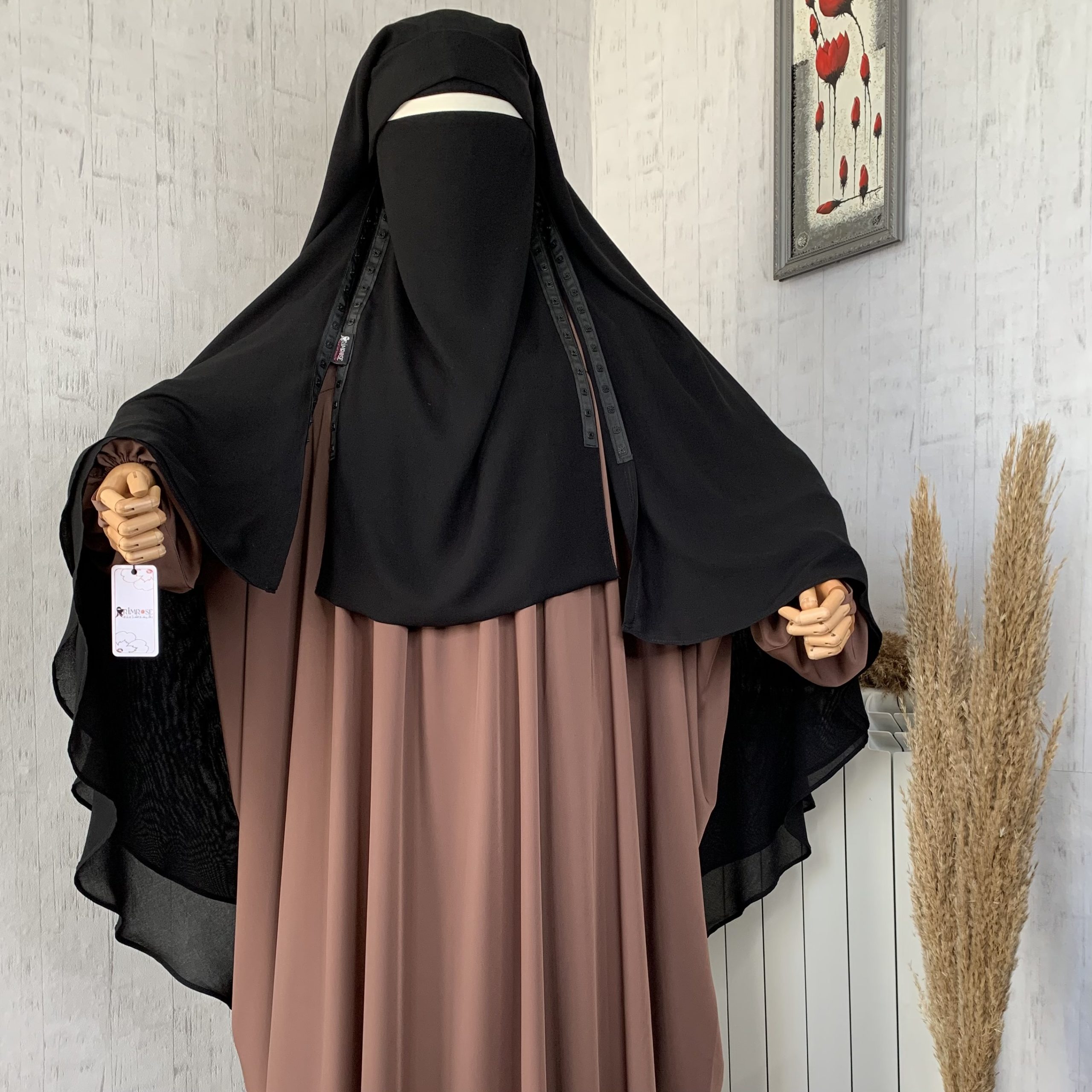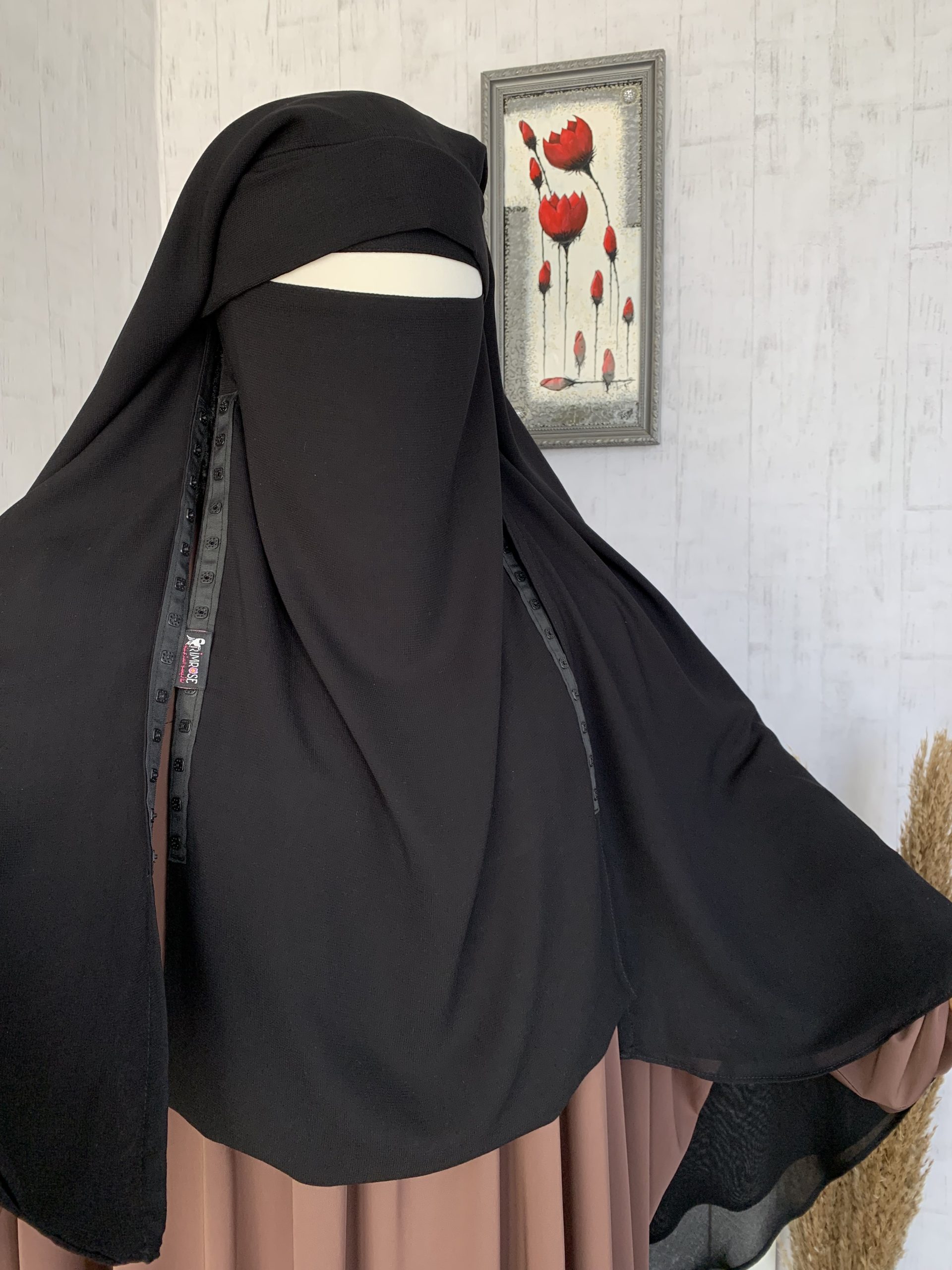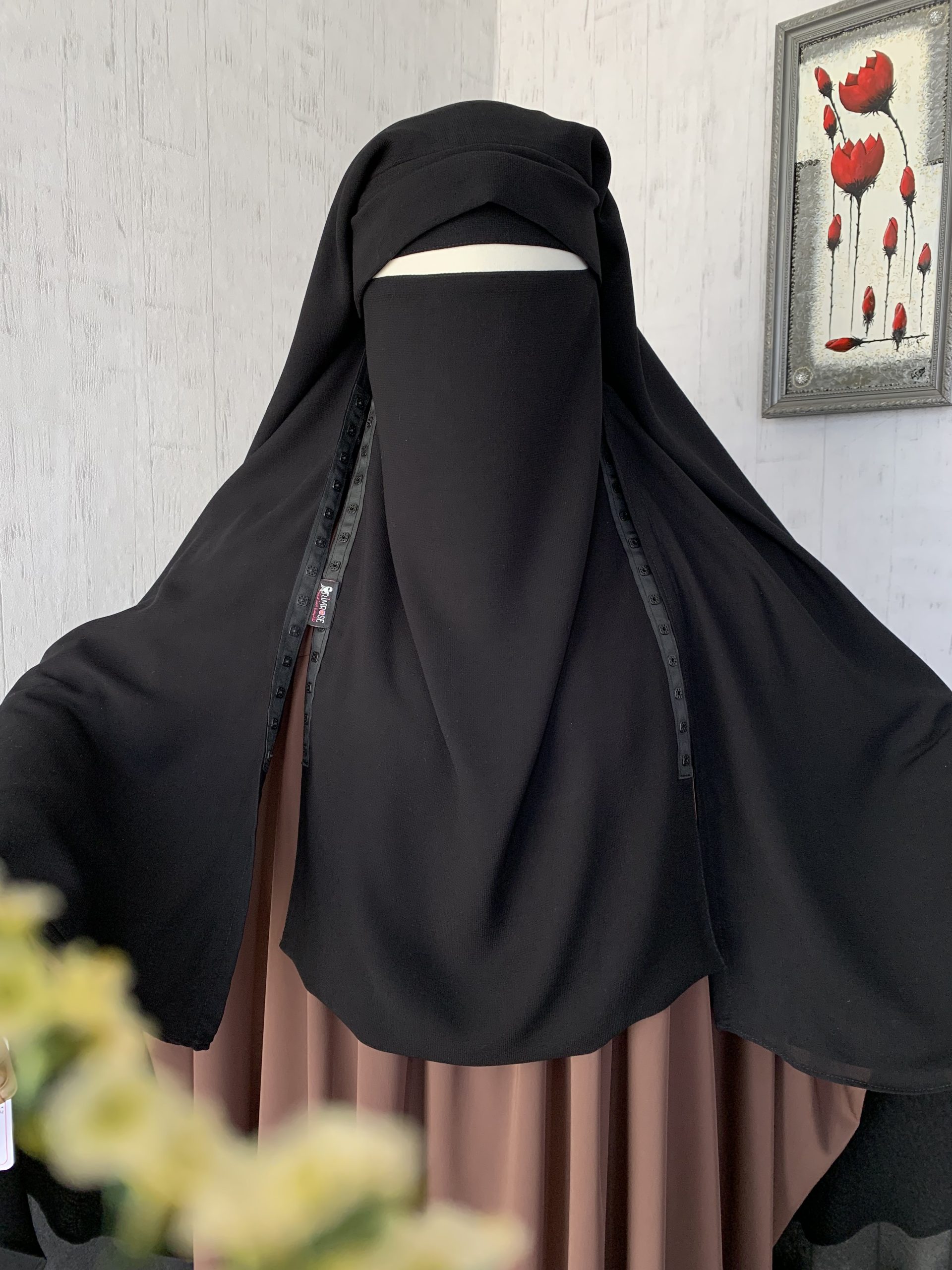 الستار بمروحتين بشكل دائري من الأسفل مع شريط من الأزرار البلاستسكية في جانبي الستار لغلقه مع النقاب